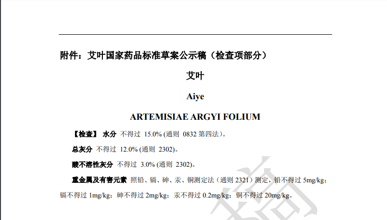 本次草案修訂,主要是根據(jù)產(chǎn)品重金屬及有害元素蓄積及與土壤相關性研究結果,擬新增重金屬與有害元素檢查項。均要求【重金屬及有害元素】照鉛、鎘、砷、汞、銅測定法(通則2321)測定,鉛不得過 5mg/kg;鎘不得過1mg/kg;砷不得過2mg/kg;汞不得過 0.2mg/kg;銅不得過 20mg/kg。